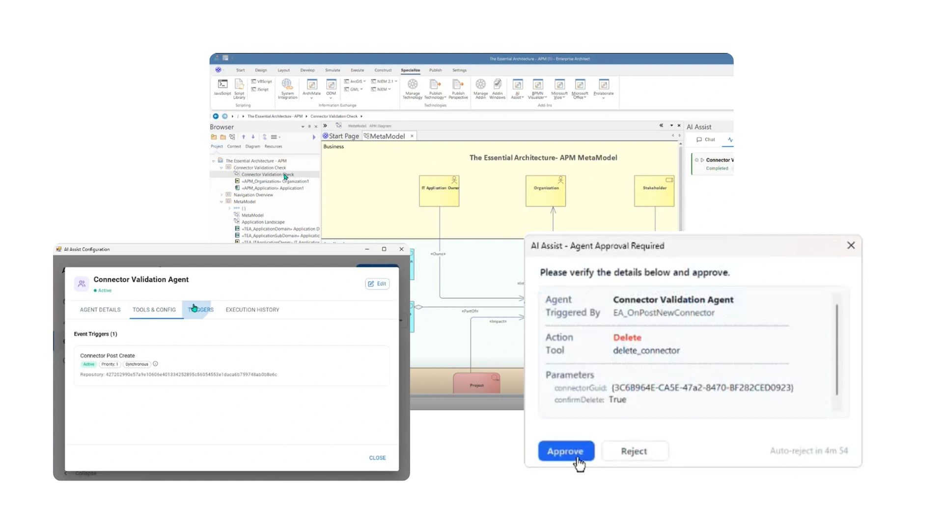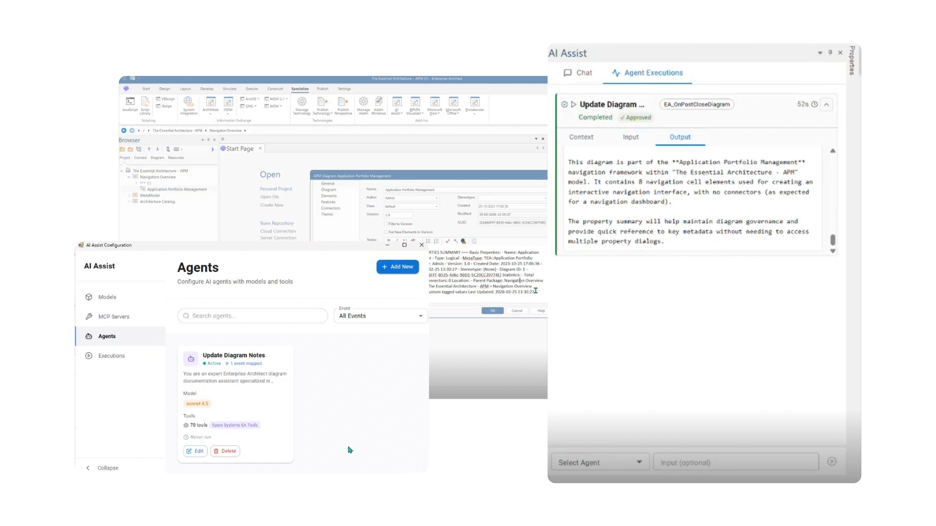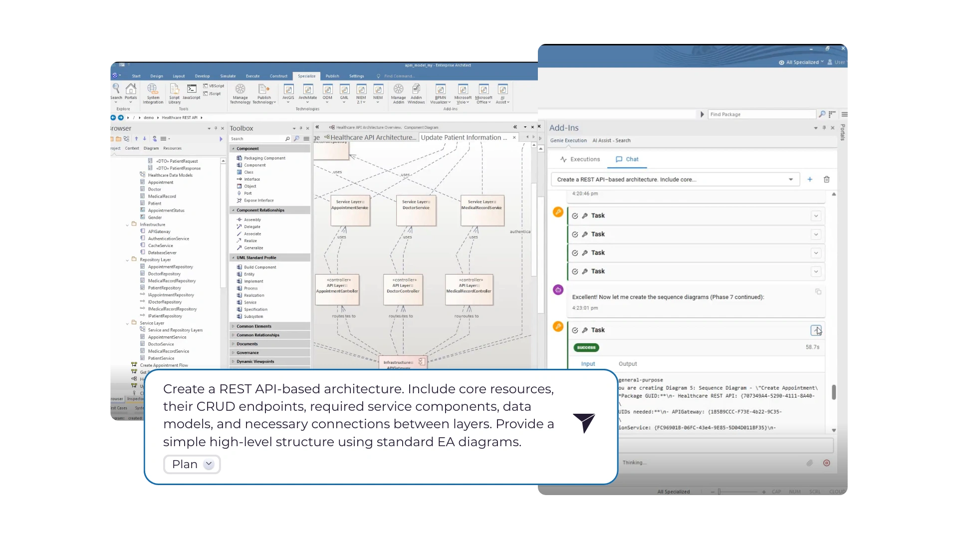 Kernaro Assist ist ein intelligentes Add-in von Sparx Systems, das KI-gestützte Funktionen direkt in Ihre Modellierungsumgebung integriert. Analysieren, erstellen, bearbeiten und verwalten Sie Architekturmodelle mithilfe natürlicher Sprache, ohne EA verlassen zu müssen.