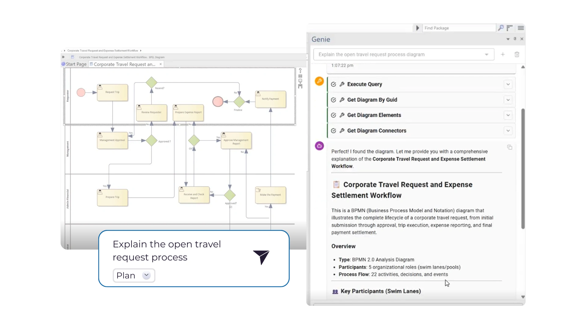 Durchsuchen Sie Ihr EA-Repository mit natürlicher Sprache. Erhalten Sie strukturierte, kontextbezogene Antworten, ohne komplexe Abfragen schreiben zu müssen.