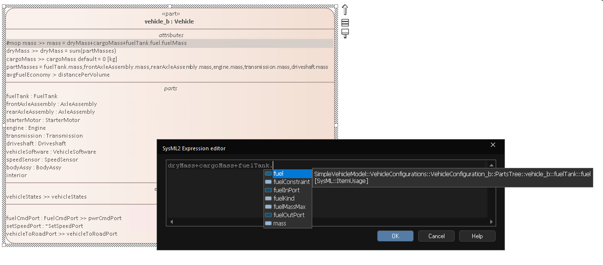 Trechoro bietet erweiterte Intellisense-Unterstützung für die Arbeit mit SysMLv2-Textnotationen, wodurch die Erstellung vereinfacht und Modellierungsfehler reduziert werden. Wenn Sie Ausdrücke wie dryMass + cargoMass + fuelTank.fuel.fuelMass eingeben, bietet Trechoro auf jeder Ebene eine kontextbezogene Autovervollständigung. Wenn Sie beispielsweise „fuelTank.“ eingeben, werden sofort gültige Eigenschaften wie „fuel“ vorgeschlagen, was eine schnelle Navigation durch tief verschachtelte Strukturen gewährleistet.
